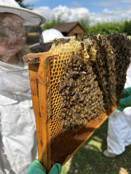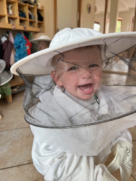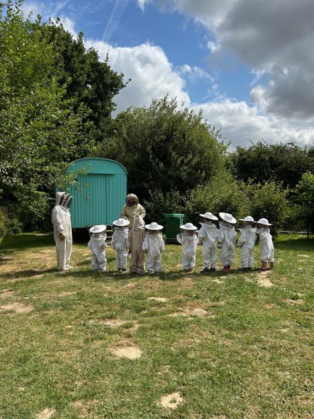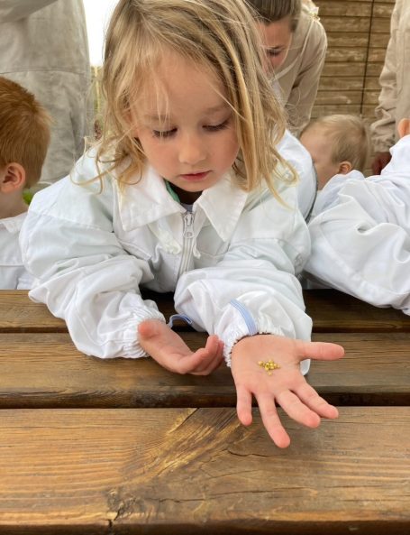 Die Kinder erleben die Bienen aus nächster Nähe. In kleinen Imkeranzügen dürfen sie dabei sein, wenn an den Bienenstöcken gearbeitet wird, beobachten das Treiben im Bienenvolk und lernen ganz praktisch, wie Bienen leben und zusammenarbeiten.