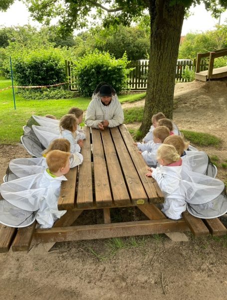 Begleitet wird die Woche von der Imkerei Hinse, die mit viel Erfahrung, Ruhe und Begeisterung Einblicke in die Arbeit mit den Bienen gibt. Die Kinder erleben dabei einen achtsamen Umgang mit Natur und Tieren und entwickeln ein erstes Verständnis für Zusammenhänge in der Natur.